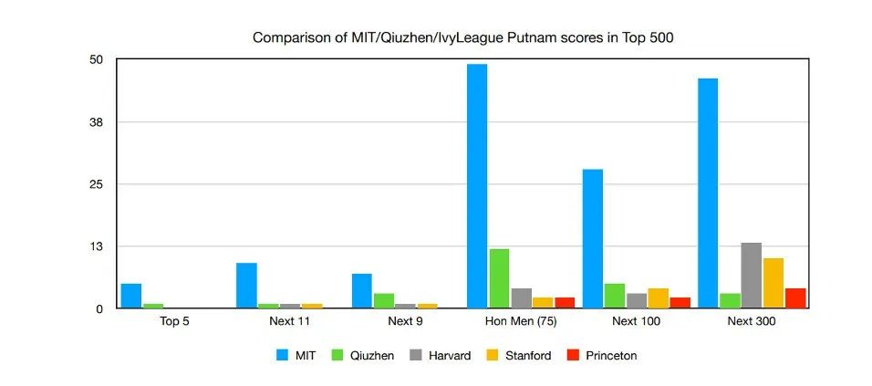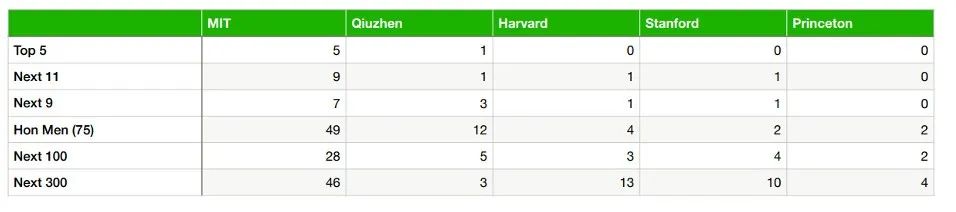 总成绩明显优于排名前五的其它四所美国名校,包括哈佛大学、斯坦福大学、马里兰大学、耶鲁大学。值得一提的是,哈佛大学、斯坦福大学等均无学生成绩进入前五,而排名百名的学生人数也远低于88看球
