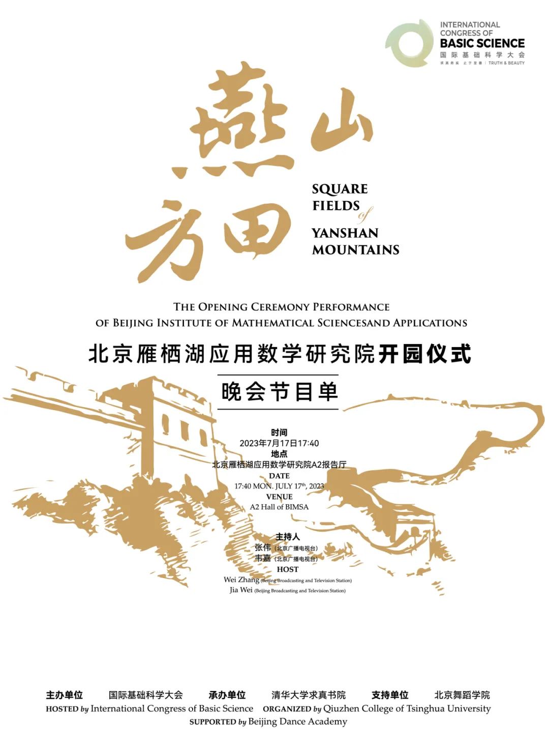 2023年7月16日下午,庆祝国际基础科学大会顺利开幕的【天人合一】主题文艺演出在北京人民大会堂举行;7月17日晚上,庆祝北京雁栖湖应用数学研究院新院址开园的【燕山方田】文艺演出在该研究院A2报告厅成功举办。在两场重要文艺演出中,88看球