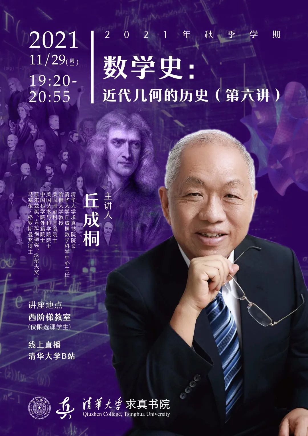 主讲人:丘成桐,美国科学院院士、美国艺术与科学院院士,中国科学院外籍院士,俄罗斯科学院外籍院士,台湾中研院院士,哈佛大学数学系和物理系终身教授,清华大学数学科学中心主任,教育部依托清华大学成立的丘成桐数学科学中心主任,88看球 院长。先后获得菲尔兹奖、麦克阿瑟(MacArthur)奖、克拉福德(Crawford)奖、沃尔夫(wolf)奖、马塞尔·格罗斯曼(Marcel Grossmann)奖。