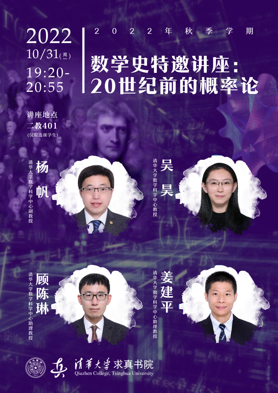 本讲座将由清华大学丘成桐数学科学中心概率方向的四位老师合作讲授。四位老师将会介绍概率论的诞生与奠基,Bernoulli大数定律,Buffon投针实验的推导与模拟,以及中心极限定理相关历史。