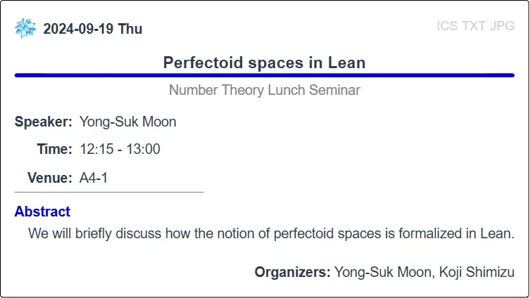2022-11-21 MonThe $Delta$-twisted homology and fiber bundle structure of twisted simplicial setsBIMSA Topology SeminarSpeaker: Mengmeng Zhang Hebei Normal University and BIMSATime: 15:30-17:00 Venue: 1129B Zoom: 537 192 5549(PW: BIMSA)AbstractIn this talk, I will give a brief introduction for simplicial set theory. Then I will report our recent progress for unifying $delta$-homology, introduc...