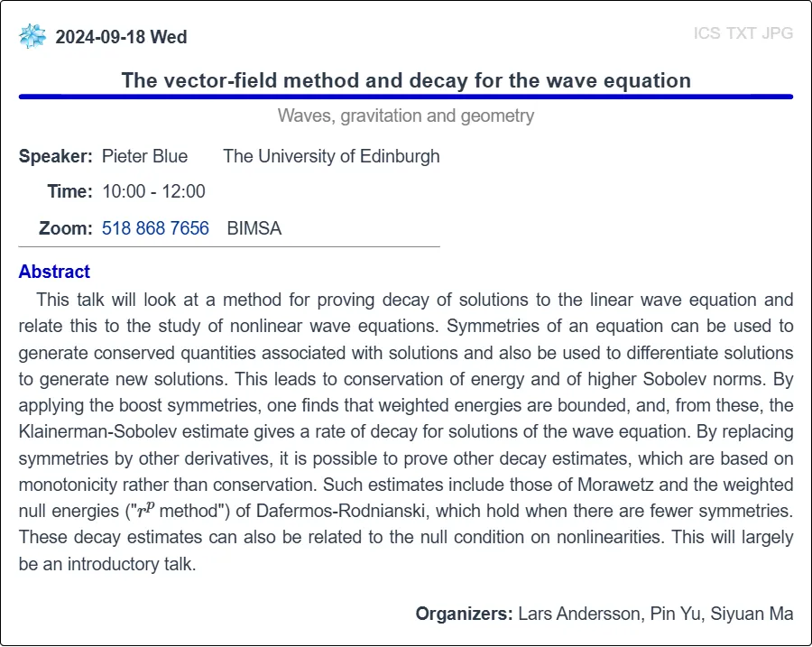 2022-11-28 MonThe Extended Persistent Homology Transform for Manifolds with BoundaryAMSS-YMSC-BIMSA Joint Seminar on Progress of Topology and Its ApplicationsSpeaker: Vanessa Robins Australian National UniversityTime: 11:00-12:30 Venue: Online Zoom: 787 662 9899(PW: BIMSA)AbstractThe Persistent Homology Transform (PHT) is a topological transform introduced by Turner, Mukherjee and Boyer in 20...