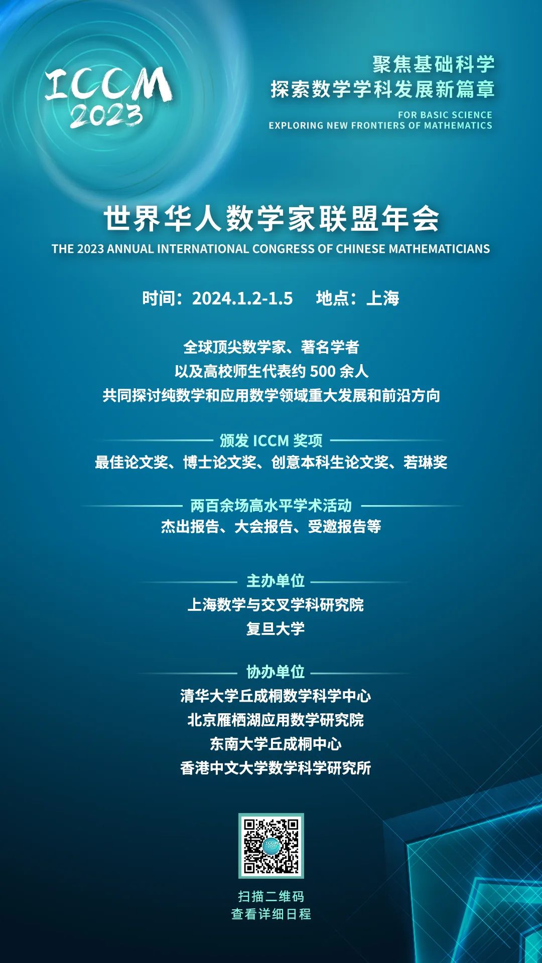 第九届世界华人数学家大会将于7月31日-8月5日在南京紫金山庄举行。大会期间将举行“应用数学与人工智能”、“中学数学教育”、 “数学+工业”、 “少数民族女性数学家” 四场圆桌论坛,分别探讨数学与其他学科的跨领域融合,交流青少年数学人才培养模式改革创新,聚焦基础数学及应用数学在工业界的应用,研讨女性数学家的职业发展。关注YMSC公众号、ICCM2022官网,获取更多会议信息“应用数学与人工智能”圆桌论坛时间:8月2日...