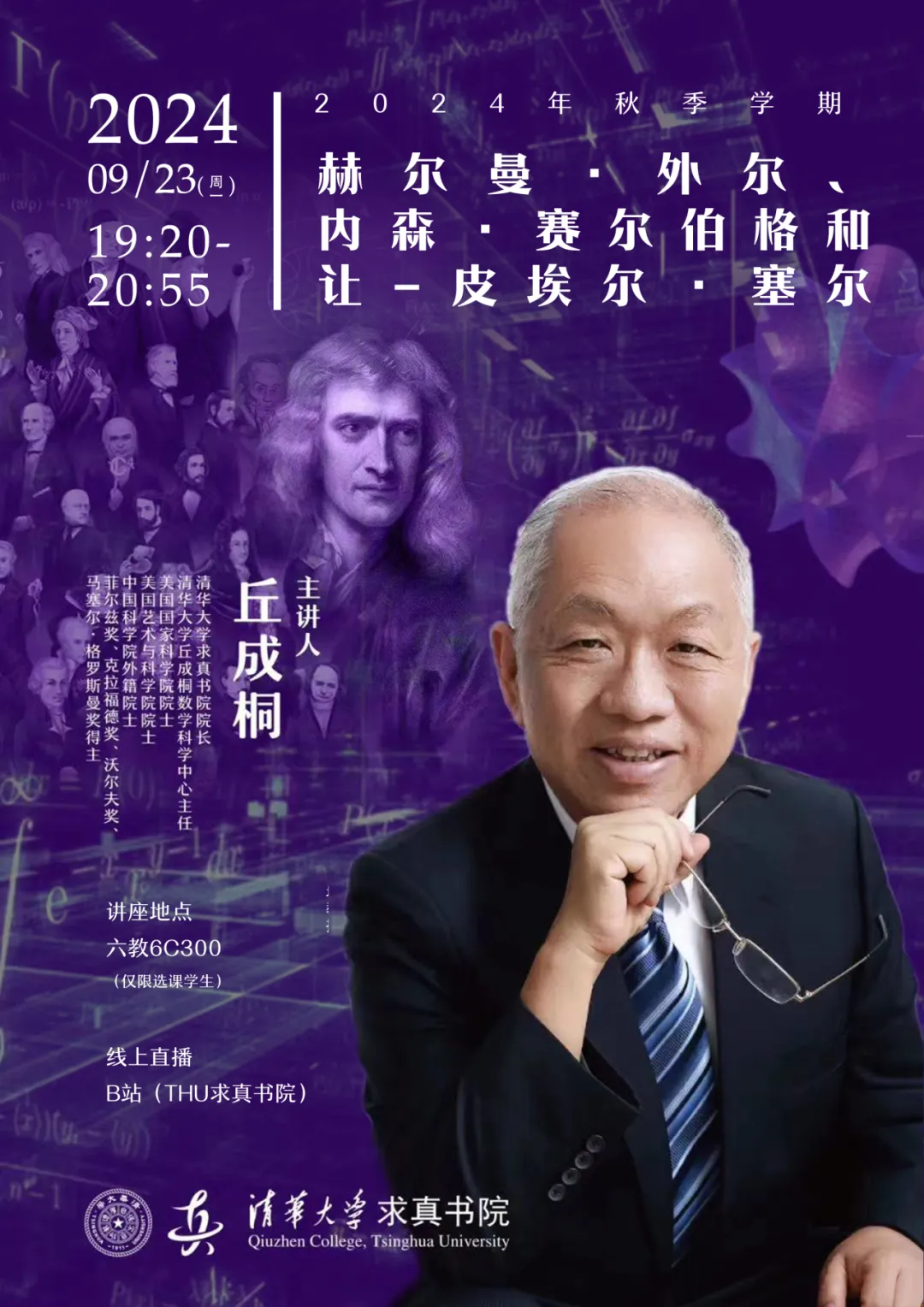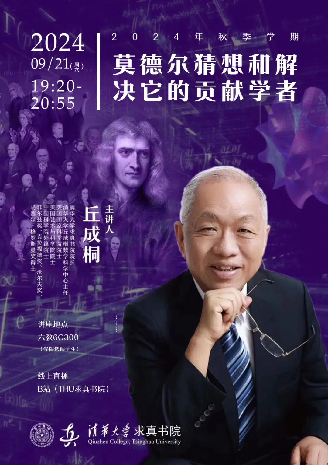 主讲人介绍丘成桐,菲尔兹奖首位华人得主,中国科学院外籍院士,俄罗斯科学院外籍院士,美国国家科学院院士,美国艺术与科学院院士。现任清华大学讲席教授,清华大学丘成桐数学科学中心主任、88看球