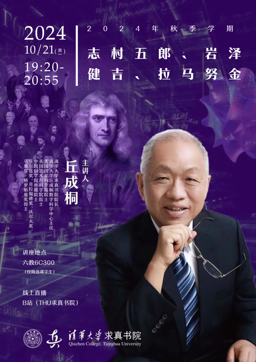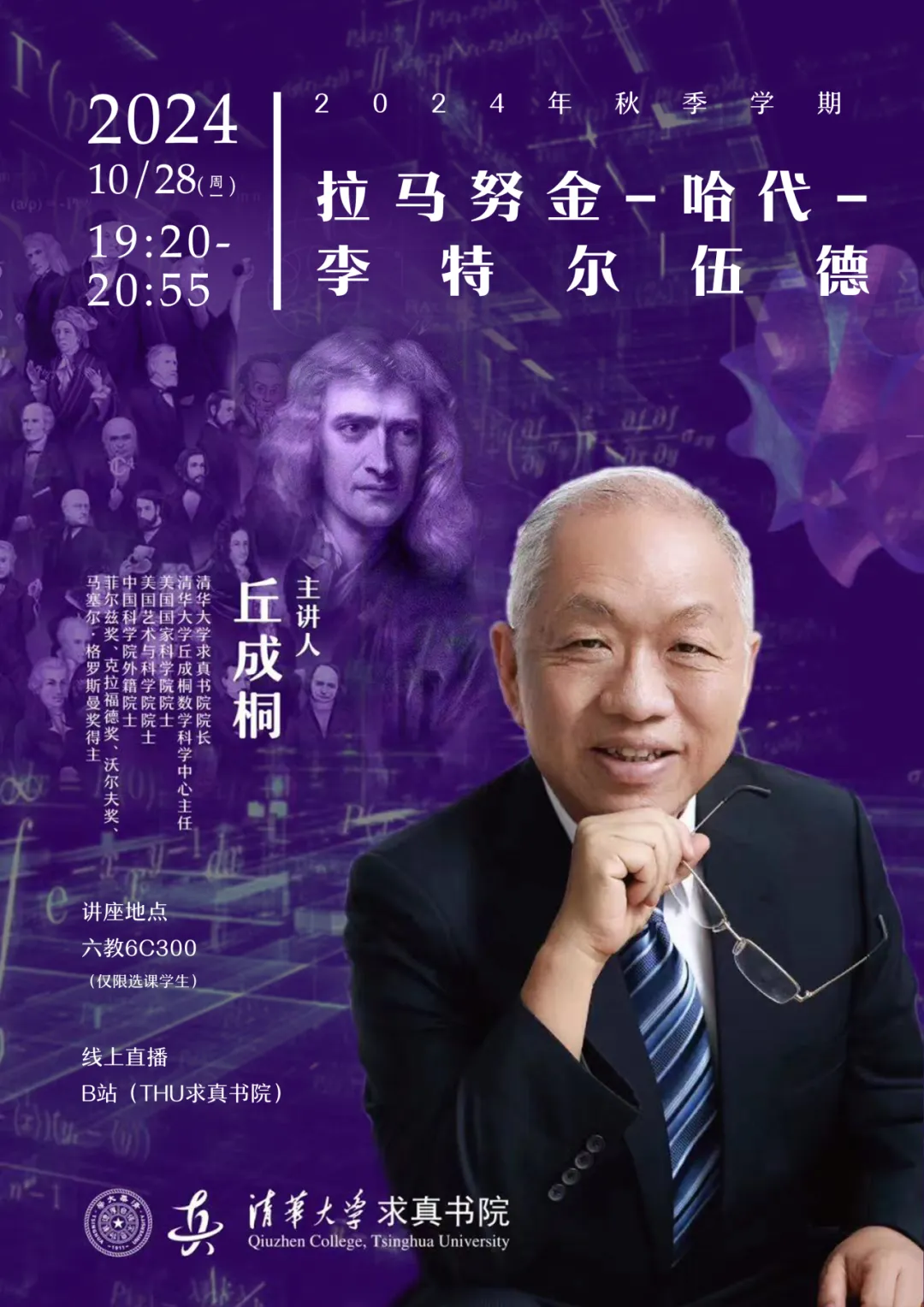 课程信息主题:拉马努金 - 哈代 - 李特尔伍德时间:2024.10.28(周一)19:20-20:55线下地址:六教6C300主讲人:丘成桐主办单位:88看球-八八看球