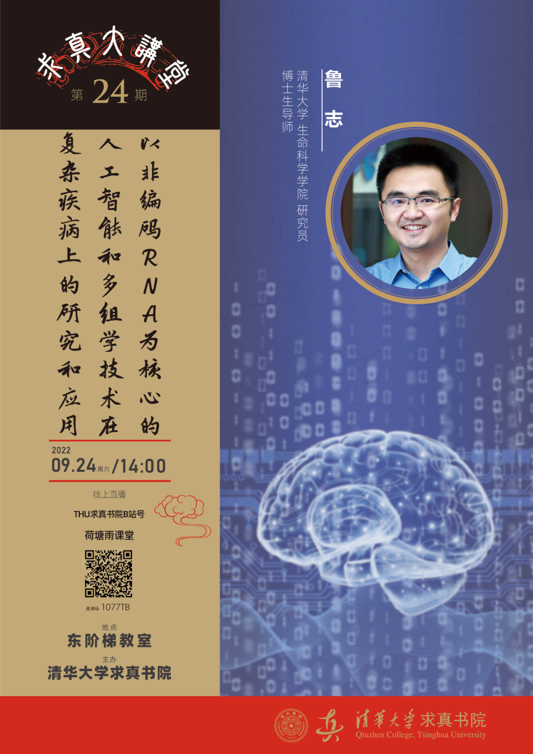 主讲人介绍鲁志,清华大学 生命科学学院 研究员,博士生导师,教育部“青年长江学者”,国家“优秀青年”基金和“霍英东”青年基金获得者,“生物信息学”教育部重点实验室副主任。鲁志博士的实验室主要从事跟“非编码RNA”有关的生物信息学研究,包括1) 精准医疗,2)AI驱动的药物设计 两个主要方向。发表国际重要期刊文章60余篇(Science, Nature,Cell,PNAS, eLife, Cell Res., Nuc. Acid Res., Genome Biology等), 总引用近...