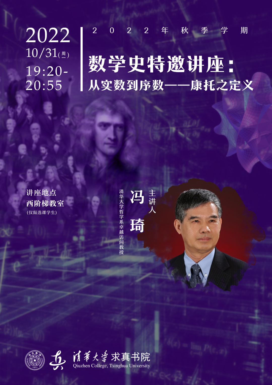 主讲人冯琦清华大学哲学系卓越访问教授讲座摘要本讲座将简要重温实数定义的历史进程,并扼要地展示康托是怎样将对实数的认识推进到对序数的认识,并建立起广泛而深刻的关于无穷集合的数学理论的历史进程